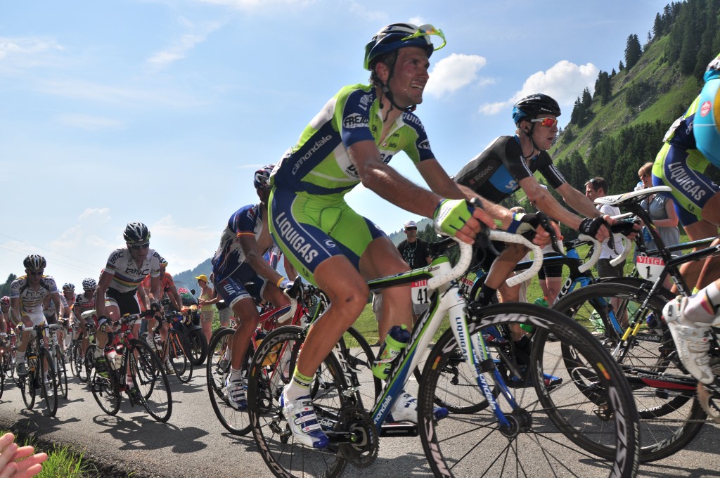 A little after getting settled The Caravan arrived, which was just crazy.  It’s an unending stream of cars that throw promotional merchandise at the spectators.  We quickly discovered that the Caravan works by the same mechanism as “Girls Gone Wild” – if you dance and cheer they throw free stuff at you.  Soon Pete and I were dancing and cheering like morons and happily rewarded with hats, shirts, food, newspapers, keychains, laundry detergent…  Pete and I brought more food down the mountain than we brought up.