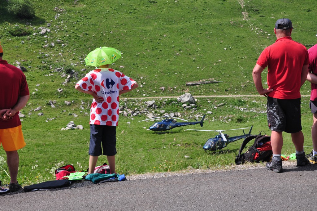 After The Caravan streamed past, five TdF VIP helicopters landed in the cow pasture right below us!  People climbed out and hiked up to the road where we were, standing right across the road from us.  I noticed that they all had “Garmin VIP” badges and apparel, so I yelled across the road, “Hey, how do you get to be a Garmin VIP?”  They laughed and all responded, “Sell a lot of Garmins!”  I thought that was pretty cool of Garmin to do that as an employee reward.